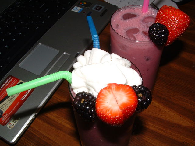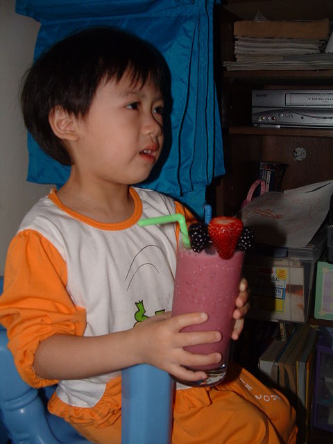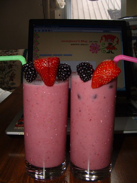 後來,第二天的下午,想想作甚麼好呢..?便洗了全部的草莓,黑莓,打算作'berry daiquiry',結果,味道還真的很不錯喔!連爹滴這個"食肉獸"也說讚喔,還很給臉的整杯喝完!不過,女兒還是不太接受,她說喝起來有籽,怪怪的.後來想想,下次可以用過濾網濾掉草莓籽,到時應該會喝吧?
