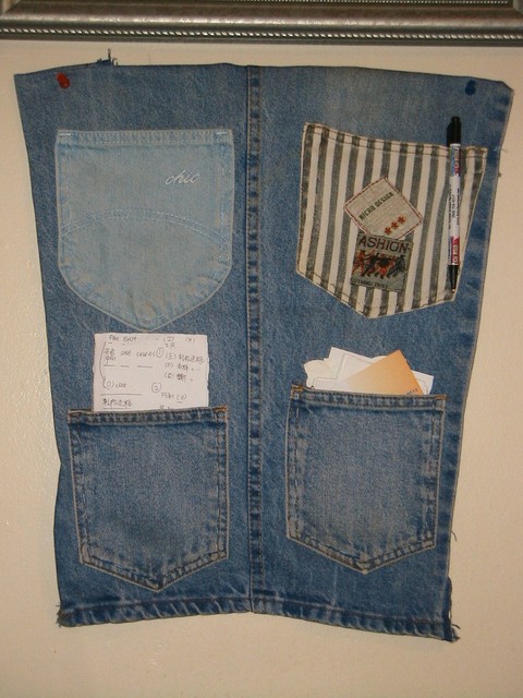 (上圖是模仿別人的作品 - 牛仔收納袋.用舊的牛仔褲拆開一個褲管,再貼上剪了好幾條牛仔褲的袋子縫上即可!一點也不難.不過新手剪牛仔褲蠻吃力的..>_