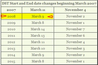 原本歷年來都從每年四月的第一個星期天開始 " 日光節約時間 " ,把時鐘調遲/快一個小時 ; 十月的最後一個星期天就調早/慢一個小時。 不過,從去年2007開始就改了。聽説是近年來的石油漲得實在可怕,現任總統爲了省更多的能源,就把這個時間提早從三月開始,延後一個星期結束。