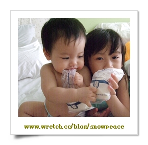 最暗搥的是, 房間的冷氣機轉鈕壞掉,轉不到冷氣的方向,嗚... 搞到兩個寶貝要打赤膊,小露兩點 > 姐姐提議拿冷凍格的 "過期" 母奶當冰袋消暑(醬都被她想到 =.=) 重點是, 小emma擠呀咬啊,玩得可高興嘞 ~