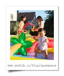 今天下午終于再次有機會在家玩那個充氣戯水池,米迷也難得陪兩個寶貝下水泡泡~~